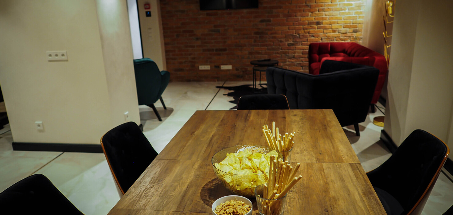 Nasz chill ooom jest w szybkie Wi-Fi oraz telewizor, co pozwala na odreagowanie po całym dniu. Dla tych, którzy potrzebują przestrzeni do pracy grupowej, dostępny jest wiekszy stół, przy którym można organizować spotkania, warsztaty czy nieformalne prezentacje.